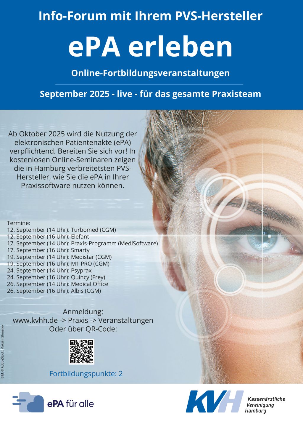 Ab Oktober 2025 wird die Nutzung der elektronischen Patientenakte (ePA) für alle Praxen verpflichtend. Unsere Veranstaltungsreihe „ePA erleben“ in Kooperation mit den Software-Anbietern der in Hamburg am häufigsten genutzten Praxisverwaltungssysteme (PVS) vermittelt praxisnah die wichtigsten Funktionen der ePA und zeigt praktische Anwendungsmöglichkeiten in den jeweiligen PVS in Online-Seminaren.